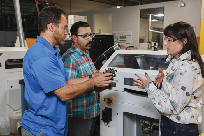 From left, Corson Cramer, Trevor Aguirre and Amy Elliott discuss the silicon carbide gyroid component, which was 3D-printed using the binder jet printer displayed in the background. (Photo courtesy ORNL, U.S. Dept. of Energy)