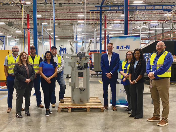 Oncor, Texas’s largest energy delivery company, received the first shipment of voltage regulators from the new Eaton production lines. Pictured with a voltage regulator (from left to right) are Jason Citrano, Oncor distribution manager; Kimberly Young, Eaton plant manager; Jake Tillery, Oncor maintenance and construction transmission supervisor; Sarah Pena, Eaton utilities sales key account manager; James Daniel, Oncor operations supervisor; Brian Earle, Eaton product line manager; Jennifer Breland, Oncor design supervisor; Astrid Hernandez, Eaton vice president utilities sales–Gulf region; and Nolan Smith, Oncor customer service executive. (Image courtesy Eaton)