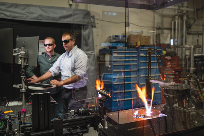 Sandia National Laboratories engineers Elijah Jans, right, and John Murray (no relation to Jon Murray) test a thermal protection system material in an inductively coupled plasma torch. Material such as this protects hypersonic vehicles from the intense heat of traveling at more than 3,8000 miles per hour. (Photo by Craig Fritz)