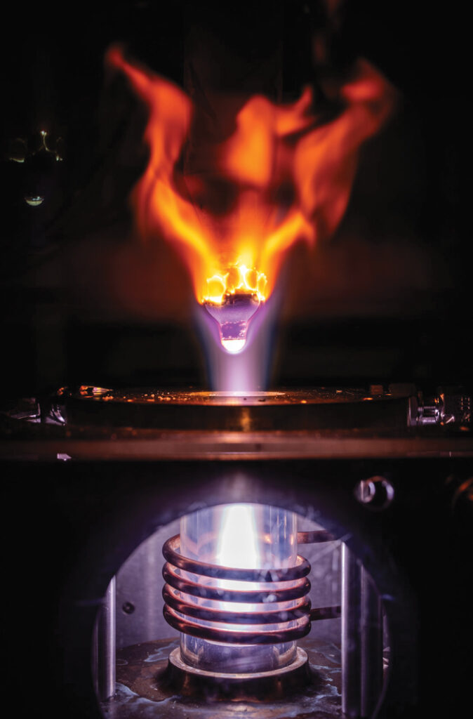 Sandia National Laboratories’ inductively coupled plasma torch is very similar to the University of Texas at Austin’s torch used to test heat-shield materials for this project. Data from the lab tests was used to refine a computer model to more rapidly evaluate materials for hypersonic vehicles. (Photo by Craig Fritz)