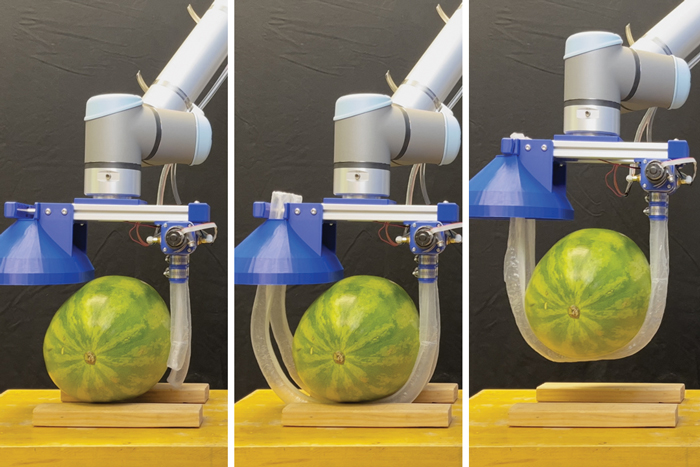 The researchers demonstrated that the vine robot can safely and stably lift a variety of heavy and fragile objects, like a watermelon. (Image courtesy of the researchers)