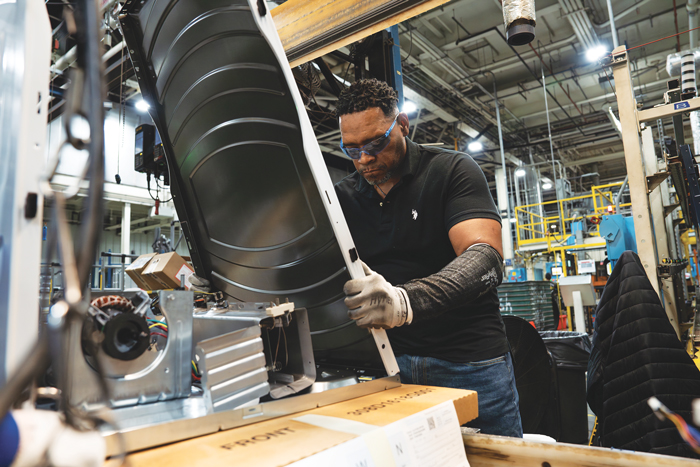 GE Appliances production team member Terrence Brackens installs a completed pre-painted steel side panel sourced from United States Steel Corporation (U.S. Steel) in Pennsylvania, and Metals USA in Ohio. These U.S.-based partners play a key role in GE Appliances’ growing American supplier ecosystem and expanded U.S. washer-dryer production. (Photo: GE Appliances, a Haier company)