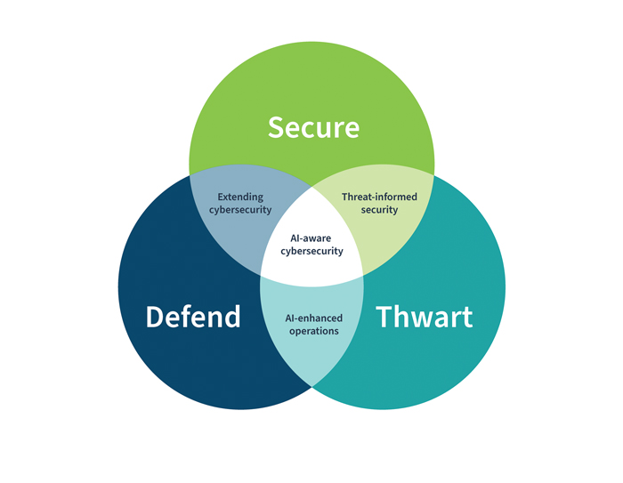 The Cyber AI Profile centers on three overlapping focus areas: securing AI systems, conducting AI-enabled cyber defense, and thwarting AI-enabled cyberattacks. (Image courtesy