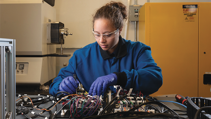 Monique McClain, assistant professor of mechanical engineering at Purdue University, adjusts circuits that power her state-of-the-art 3D printers. (Purdue University photo/John Underwood)