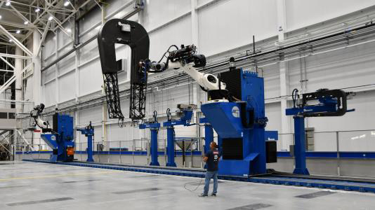 An ultrasonic-equipped robot arm inspects aerospace structures at Spirit AeroSystems. (Image by Spirit AeroSystems.)